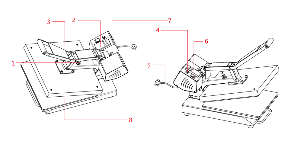 1. 手柄 2.定时器和温度控制器 3.加热器 4.保险丝 5. 电源线 6. 开关 7.压力调节螺丝 8. 硅板